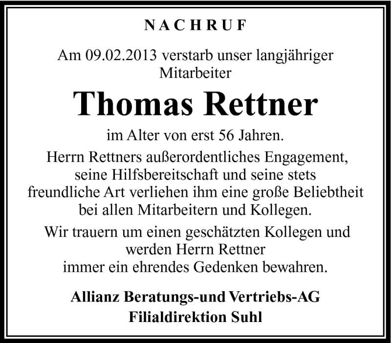 Hier finden Sie alle Traueranzeigen aus der Zeitung, die bisher für Thomas Rettner erschienen sind. Weitere Traueranzeigen, die in der Zeitung erscheinen, werden hier ebenfalls aufgelistet
