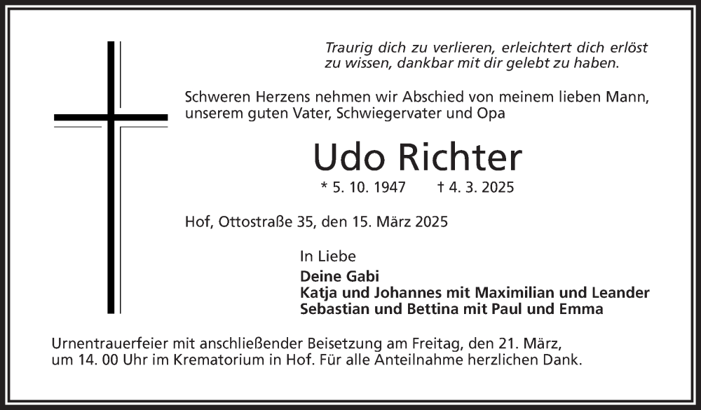 Hier finden Sie alle Traueranzeigen aus der Zeitung, die bisher für Udo Richter erschienen sind. Weitere Traueranzeigen, die in der Zeitung erscheinen, werden hier ebenfalls aufgelistet
