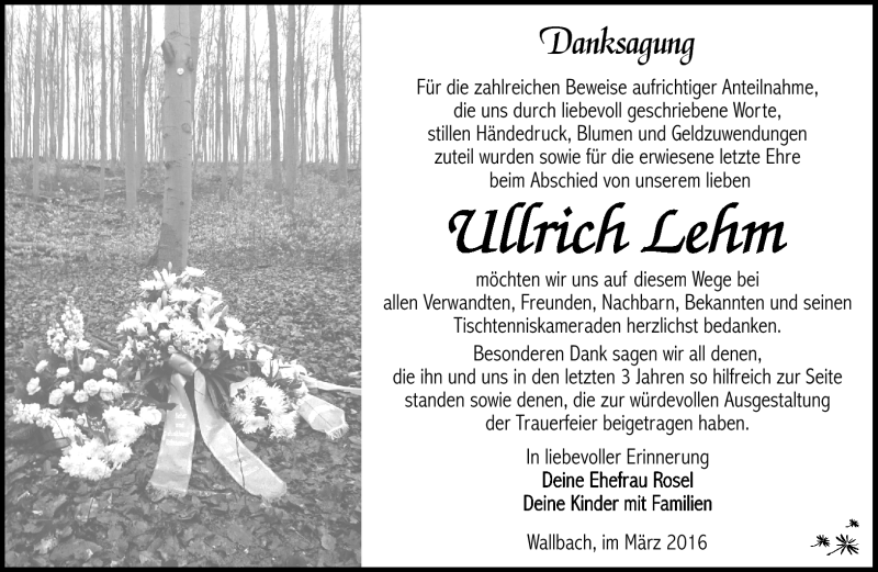 Hier finden Sie alle Traueranzeigen aus der Zeitung, die bisher für Ullrich Lehm erschienen sind. Weitere Traueranzeigen, die in der Zeitung erscheinen, werden hier ebenfalls aufgelistet