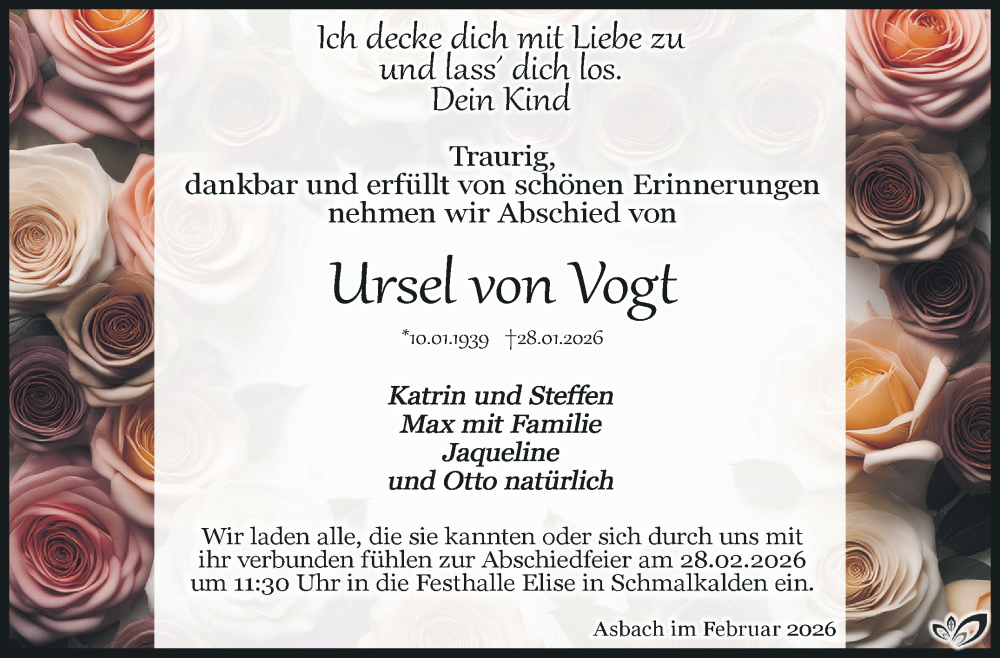 Hier finden Sie alle Traueranzeigen aus der Zeitung, die bisher für Ursel von Vogt erschienen sind. Weitere Traueranzeigen, die in der Zeitung erscheinen, werden hier ebenfalls aufgelistet
