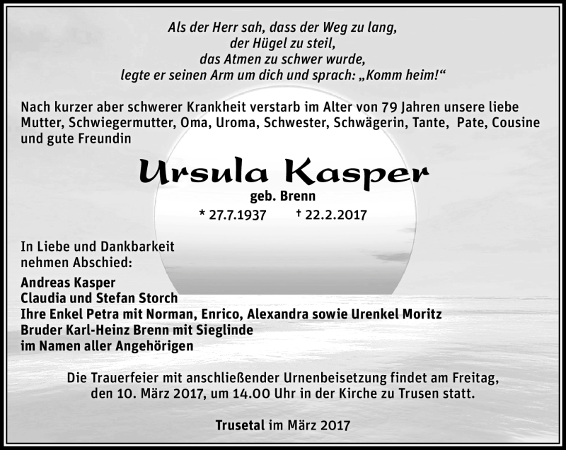 Hier finden Sie alle Traueranzeigen aus der Zeitung, die bisher für Ursula Kasper erschienen sind. Weitere Traueranzeigen, die in der Zeitung erscheinen, werden hier ebenfalls aufgelistet