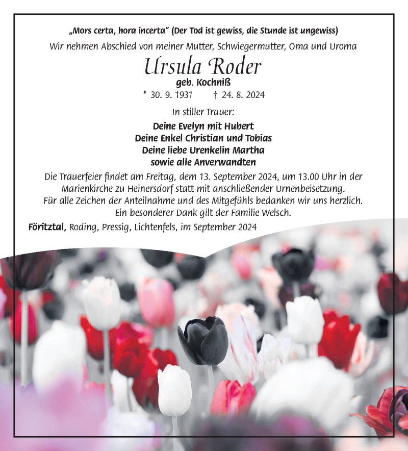 Hier finden Sie alle Traueranzeigen aus der Zeitung, die bisher für Ursula Roder erschienen sind. Weitere Traueranzeigen, die in der Zeitung erscheinen, werden hier ebenfalls aufgelistet