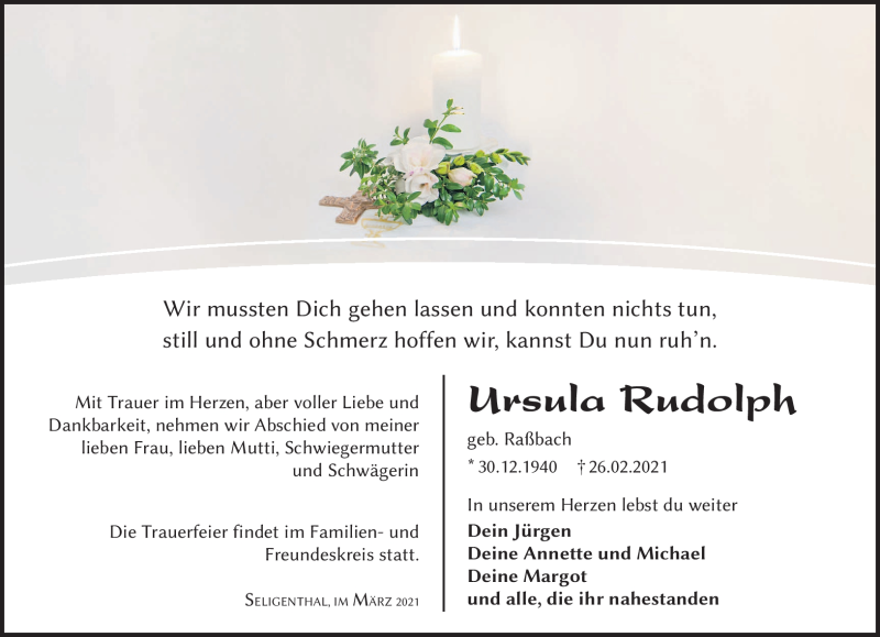 Hier finden Sie alle Traueranzeigen aus der Zeitung, die bisher für Ursula Rudolph erschienen sind. Weitere Traueranzeigen, die in der Zeitung erscheinen, werden hier ebenfalls aufgelistet