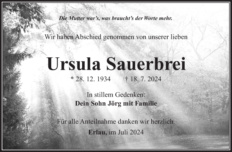 Hier finden Sie alle Traueranzeigen aus der Zeitung, die bisher für Ursula Sauerbrei erschienen sind. Weitere Traueranzeigen, die in der Zeitung erscheinen, werden hier ebenfalls aufgelistet