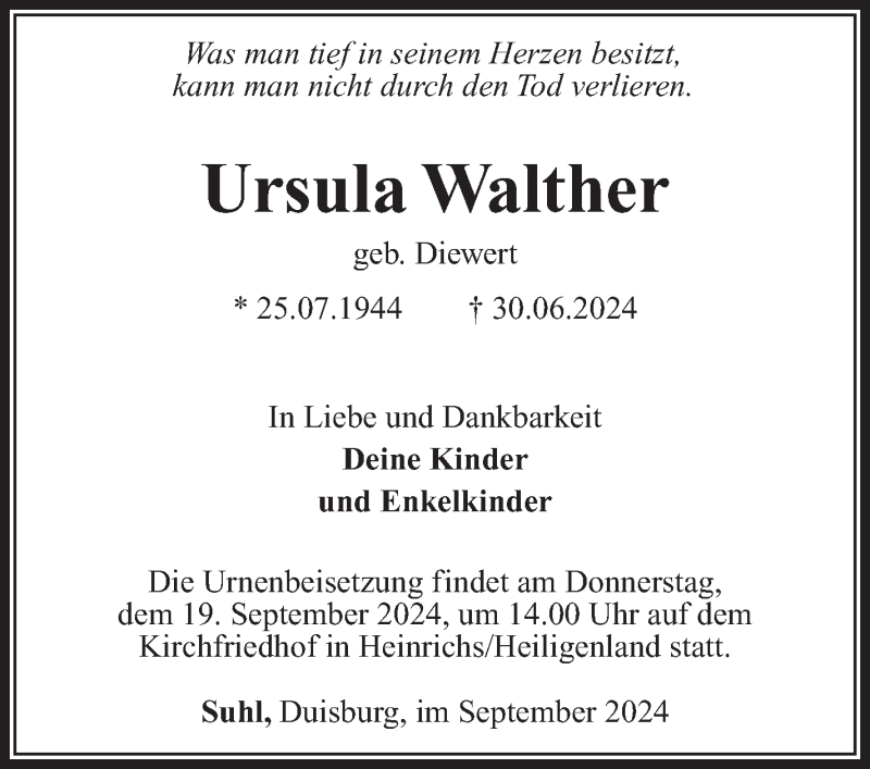 Hier finden Sie alle Traueranzeigen aus der Zeitung, die bisher für Ursula Walther erschienen sind. Weitere Traueranzeigen, die in der Zeitung erscheinen, werden hier ebenfalls aufgelistet