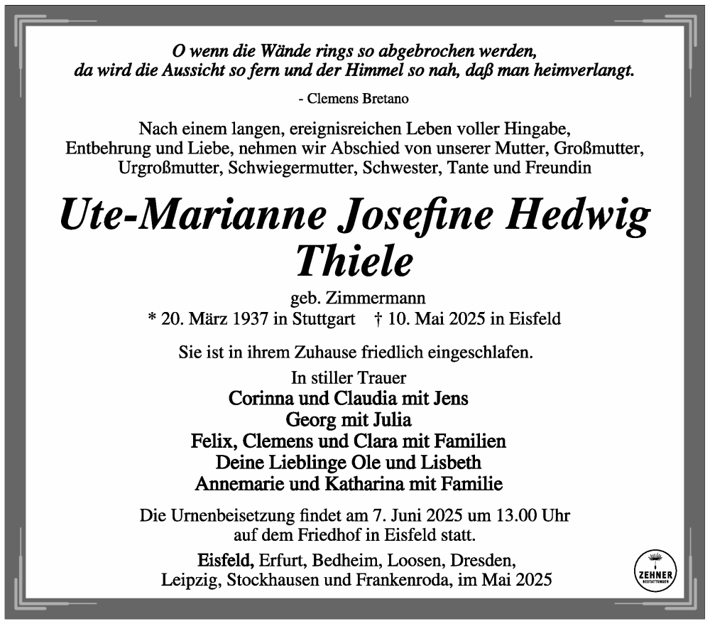 Hier finden Sie alle Traueranzeigen aus der Zeitung, die bisher für Ute-Marianne Josefine Hedwig Thiele erschienen sind. Weitere Traueranzeigen, die in der Zeitung erscheinen, werden hier ebenfalls aufgelistet