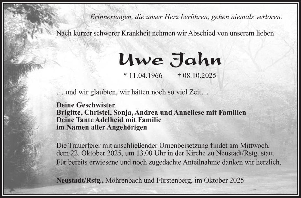 Hier finden Sie alle Traueranzeigen aus der Zeitung, die bisher für Uwe Jahn erschienen sind. Weitere Traueranzeigen, die in der Zeitung erscheinen, werden hier ebenfalls aufgelistet