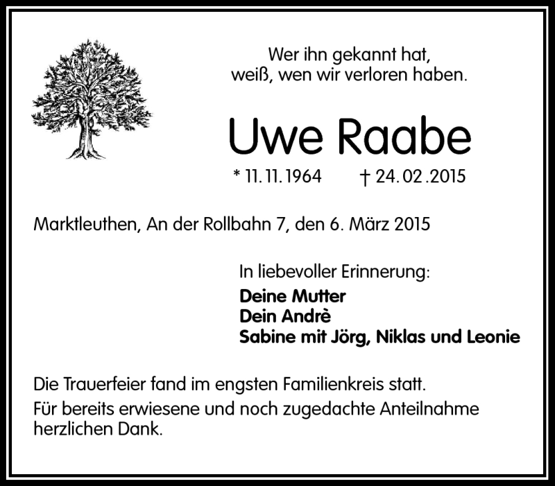 Hier finden Sie alle Traueranzeigen aus der Zeitung, die bisher für Uwe Raabe erschienen sind. Weitere Traueranzeigen, die in der Zeitung erscheinen, werden hier ebenfalls aufgelistet