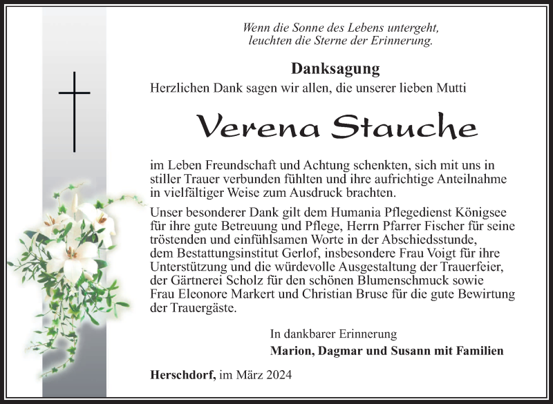 Hier finden Sie alle Traueranzeigen aus der Zeitung, die bisher für Verena Stauche erschienen sind. Weitere Traueranzeigen, die in der Zeitung erscheinen, werden hier ebenfalls aufgelistet