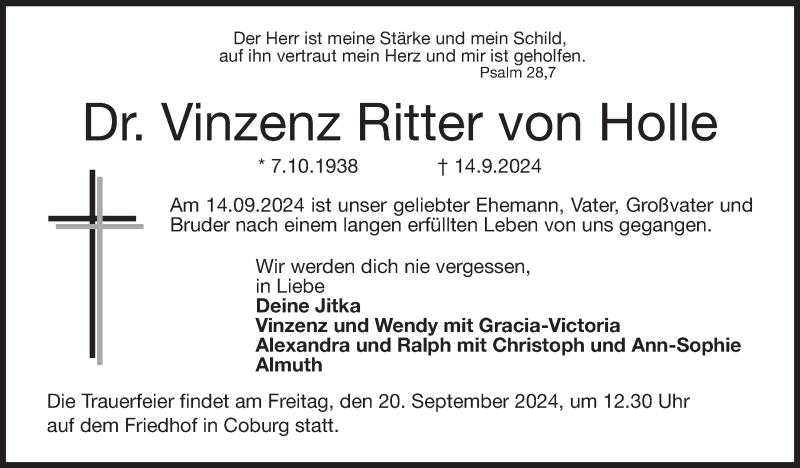 Hier finden Sie alle Traueranzeigen aus der Zeitung, die bisher für Vinzenz Ritter von Holle erschienen sind. Weitere Traueranzeigen, die in der Zeitung erscheinen, werden hier ebenfalls aufgelistet