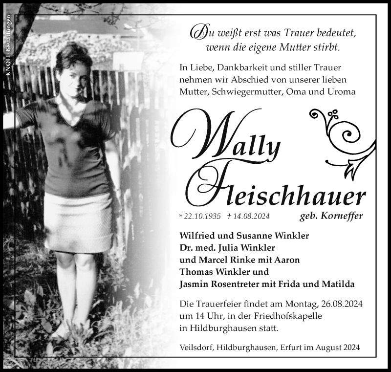 Hier finden Sie alle Traueranzeigen aus der Zeitung, die bisher für Wally Fleischhauer erschienen sind. Weitere Traueranzeigen, die in der Zeitung erscheinen, werden hier ebenfalls aufgelistet