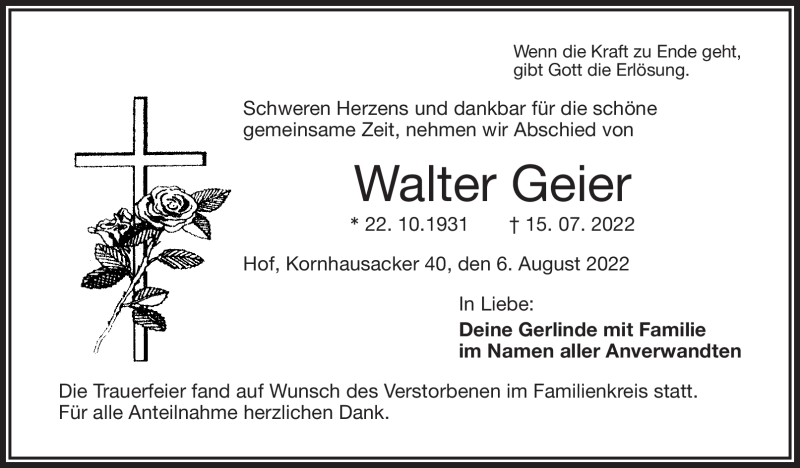 Hier finden Sie alle Traueranzeigen aus der Zeitung, die bisher für Walter Geier erschienen sind. Weitere Traueranzeigen, die in der Zeitung erscheinen, werden hier ebenfalls aufgelistet