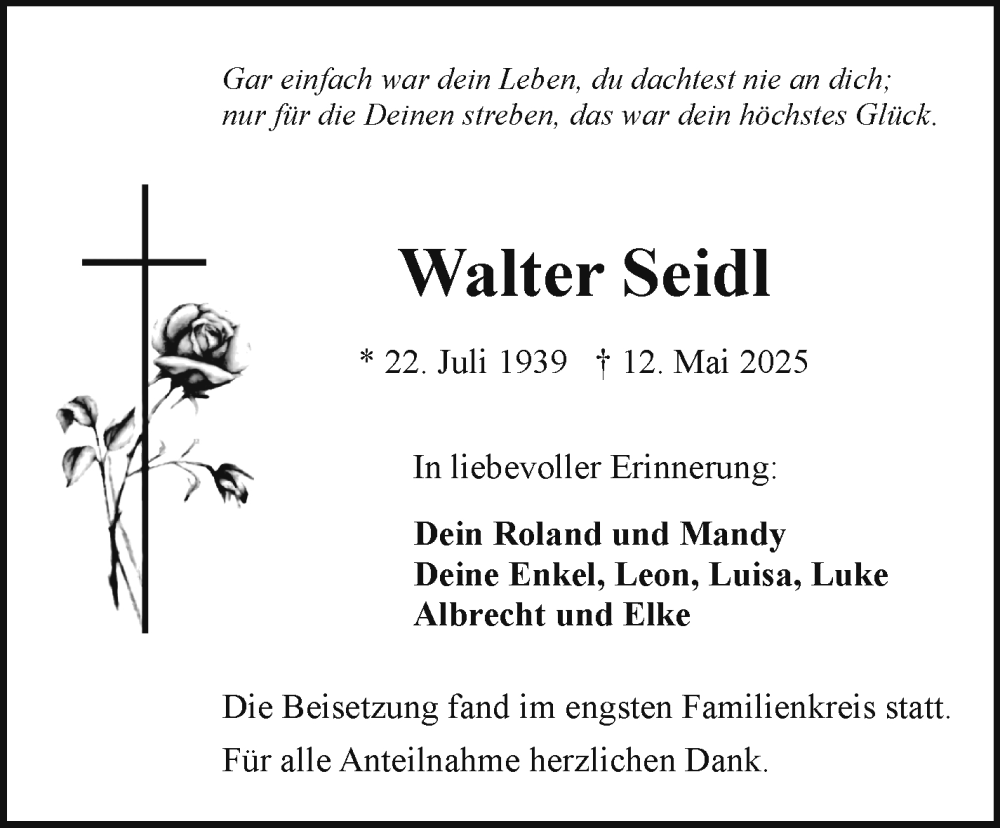 Hier finden Sie alle Traueranzeigen aus der Zeitung, die bisher für Walter Seidl erschienen sind. Weitere Traueranzeigen, die in der Zeitung erscheinen, werden hier ebenfalls aufgelistet