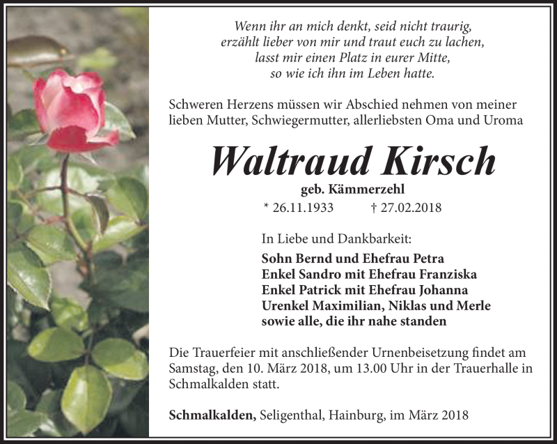 Hier finden Sie alle Traueranzeigen aus der Zeitung, die bisher für Waltraud Kirsch erschienen sind. Weitere Traueranzeigen, die in der Zeitung erscheinen, werden hier ebenfalls aufgelistet