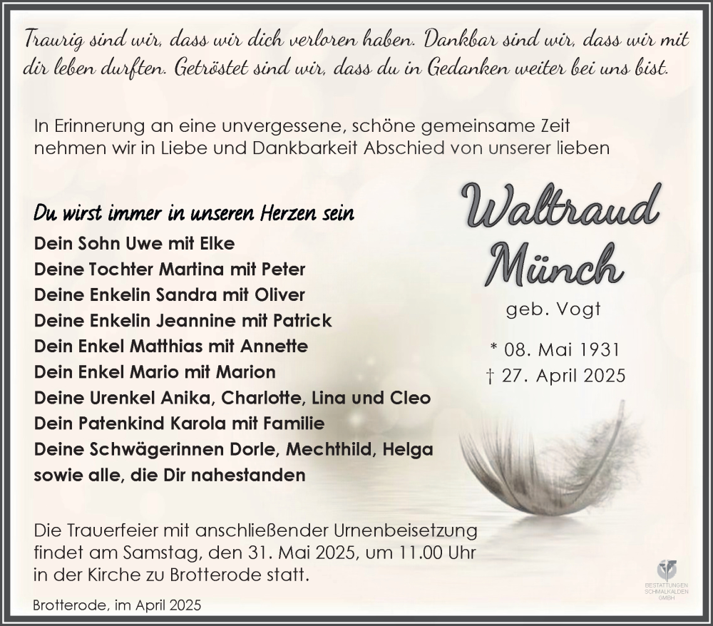 Hier finden Sie alle Traueranzeigen aus der Zeitung, die bisher für Waltraud Münch erschienen sind. Weitere Traueranzeigen, die in der Zeitung erscheinen, werden hier ebenfalls aufgelistet