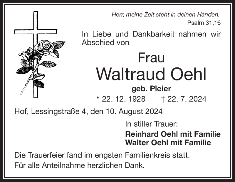 Hier finden Sie alle Traueranzeigen aus der Zeitung, die bisher für Waltraud Oehl erschienen sind. Weitere Traueranzeigen, die in der Zeitung erscheinen, werden hier ebenfalls aufgelistet