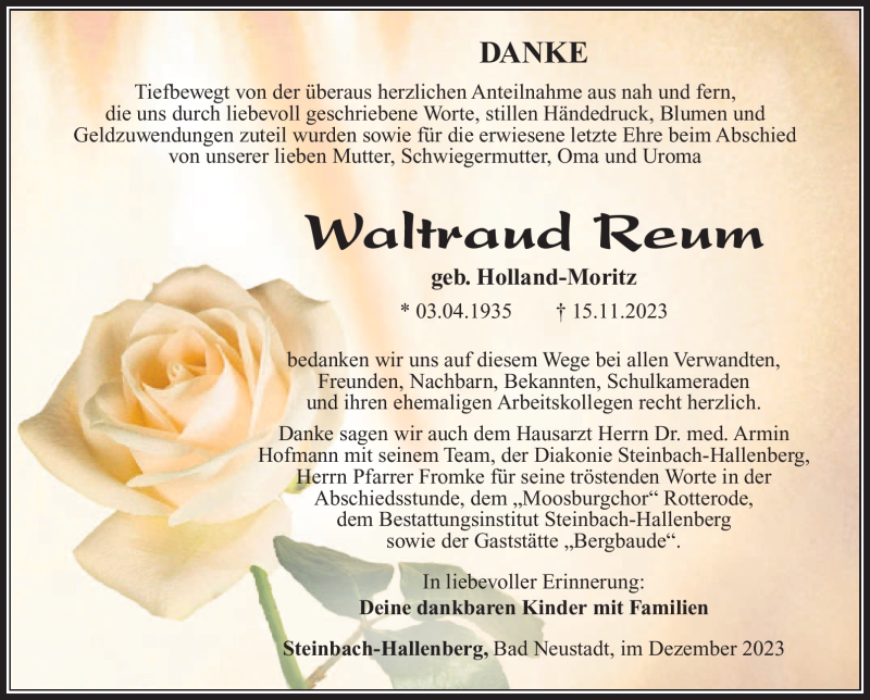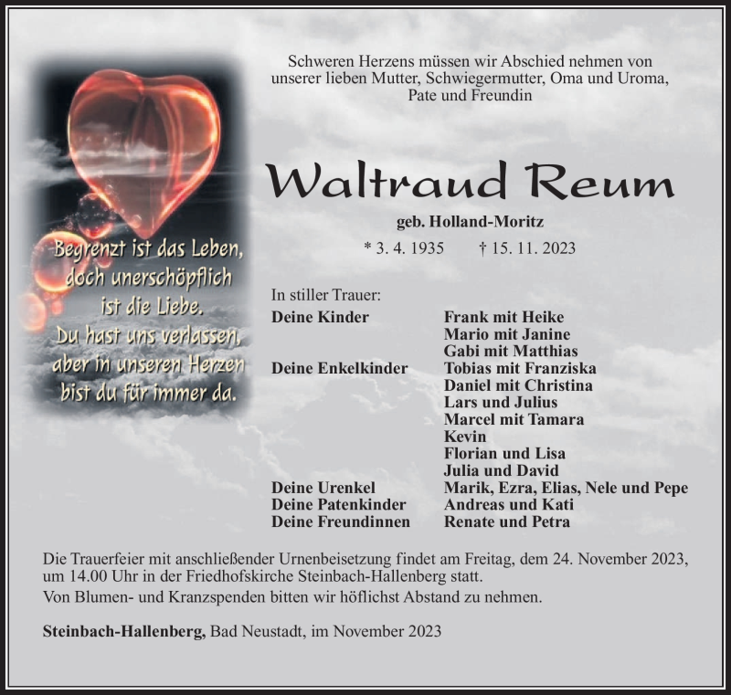 Hier finden Sie alle Traueranzeigen aus der Zeitung, die bisher für Waltraud Reum erschienen sind. Weitere Traueranzeigen, die in der Zeitung erscheinen, werden hier ebenfalls aufgelistet