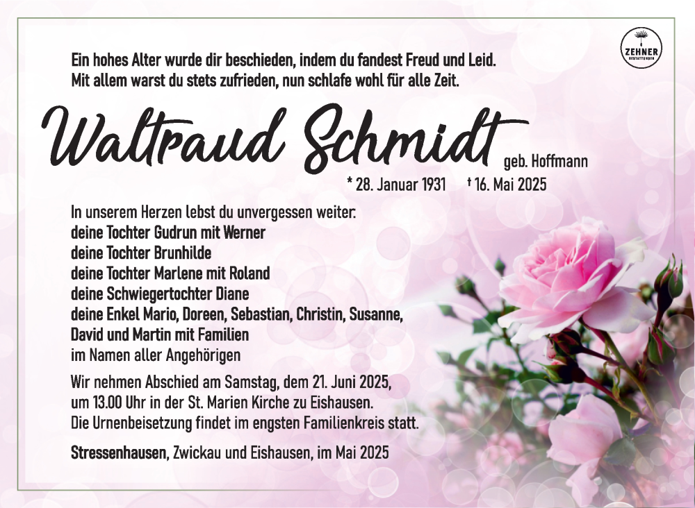 Hier finden Sie alle Traueranzeigen aus der Zeitung, die bisher für Waltraud Schmidt erschienen sind. Weitere Traueranzeigen, die in der Zeitung erscheinen, werden hier ebenfalls aufgelistet