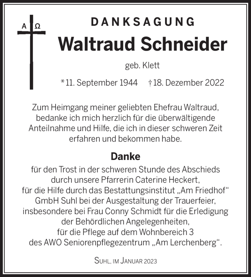 Hier finden Sie alle Traueranzeigen aus der Zeitung, die bisher für Waltraud Schneider erschienen sind. Weitere Traueranzeigen, die in der Zeitung erscheinen, werden hier ebenfalls aufgelistet