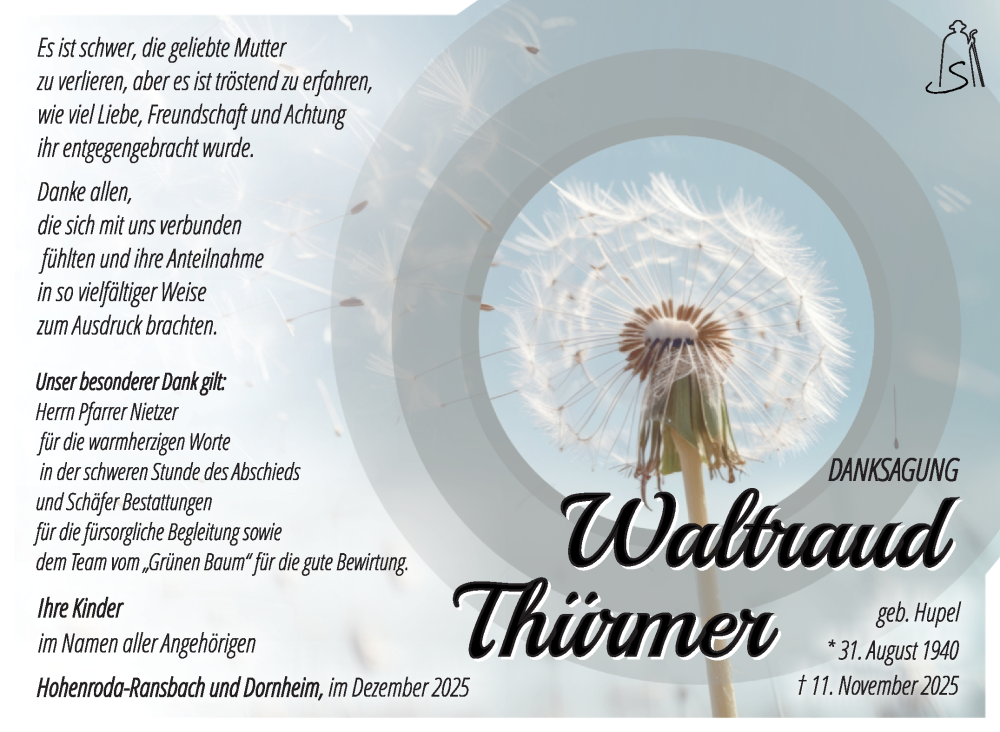 Hier finden Sie alle Traueranzeigen aus der Zeitung, die bisher für Waltraud Thürmer erschienen sind. Weitere Traueranzeigen, die in der Zeitung erscheinen, werden hier ebenfalls aufgelistet