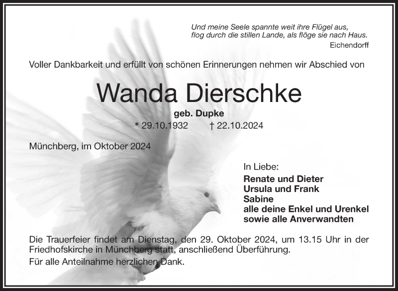 Hier finden Sie alle Traueranzeigen aus der Zeitung, die bisher für Wanda Dierschke erschienen sind. Weitere Traueranzeigen, die in der Zeitung erscheinen, werden hier ebenfalls aufgelistet