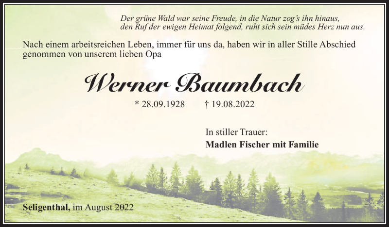 Hier finden Sie alle Traueranzeigen aus der Zeitung, die bisher für Werner Baumbach erschienen sind. Weitere Traueranzeigen, die in der Zeitung erscheinen, werden hier ebenfalls aufgelistet