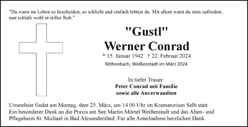 Hier finden Sie alle Traueranzeigen aus der Zeitung, die bisher für Werner Conrad erschienen sind. Weitere Traueranzeigen, die in der Zeitung erscheinen, werden hier ebenfalls aufgelistet