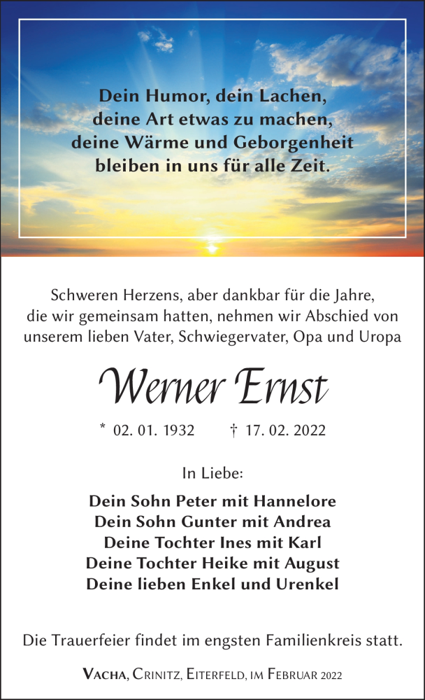 Hier finden Sie alle Traueranzeigen aus der Zeitung, die bisher für Werner Ernst erschienen sind. Weitere Traueranzeigen, die in der Zeitung erscheinen, werden hier ebenfalls aufgelistet