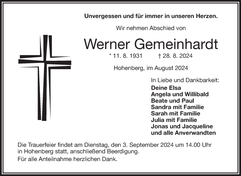 Hier finden Sie alle Traueranzeigen aus der Zeitung, die bisher für Werner Gemeinhardt erschienen sind. Weitere Traueranzeigen, die in der Zeitung erscheinen, werden hier ebenfalls aufgelistet