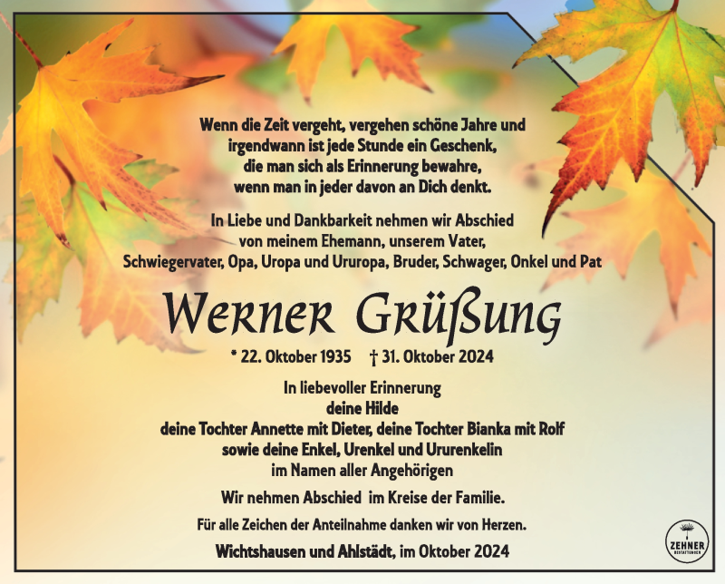 Hier finden Sie alle Traueranzeigen aus der Zeitung, die bisher für Werner Grüßung erschienen sind. Weitere Traueranzeigen, die in der Zeitung erscheinen, werden hier ebenfalls aufgelistet