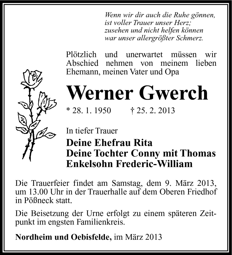 Hier finden Sie alle Traueranzeigen aus der Zeitung, die bisher für Werner Gwerch erschienen sind. Weitere Traueranzeigen, die in der Zeitung erscheinen, werden hier ebenfalls aufgelistet