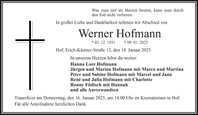 Hier finden Sie alle Traueranzeigen aus der Zeitung, die bisher für Werner Hofmann erschienen sind. Weitere Traueranzeigen, die in der Zeitung erscheinen, werden hier ebenfalls aufgelistet