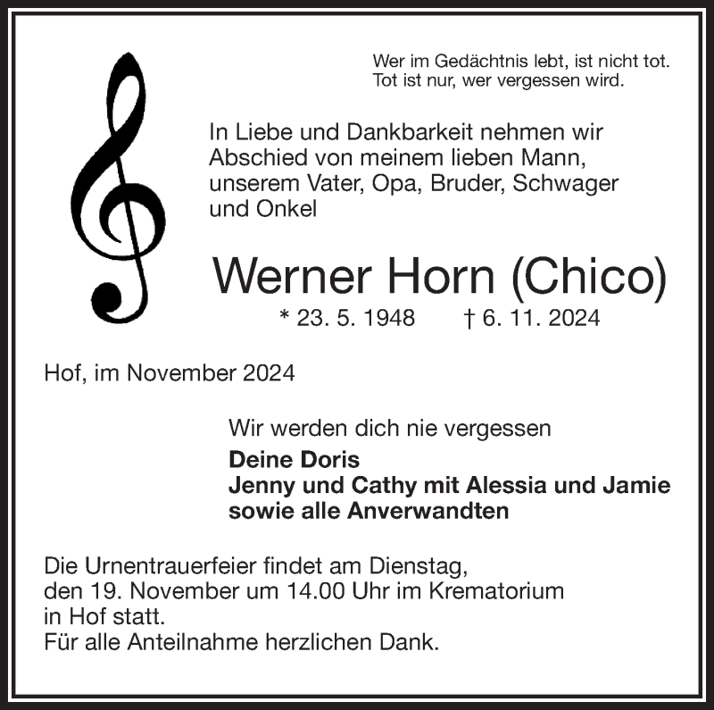 Hier finden Sie alle Traueranzeigen aus der Zeitung, die bisher für Werner Horn erschienen sind. Weitere Traueranzeigen, die in der Zeitung erscheinen, werden hier ebenfalls aufgelistet