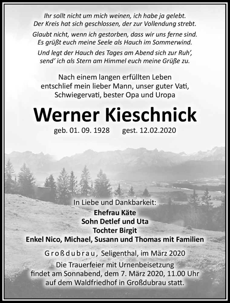 Hier finden Sie alle Traueranzeigen aus der Zeitung, die bisher für Werner Kieschnick erschienen sind. Weitere Traueranzeigen, die in der Zeitung erscheinen, werden hier ebenfalls aufgelistet