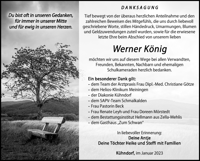 Hier finden Sie alle Traueranzeigen aus der Zeitung, die bisher für Werner König erschienen sind. Weitere Traueranzeigen, die in der Zeitung erscheinen, werden hier ebenfalls aufgelistet