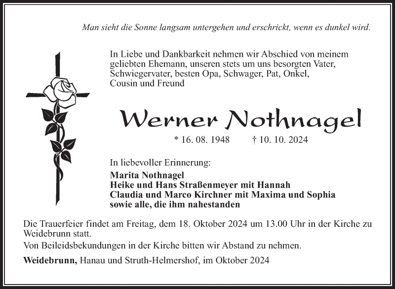 Hier finden Sie alle Traueranzeigen aus der Zeitung, die bisher für Werner Nothnagel erschienen sind. Weitere Traueranzeigen, die in der Zeitung erscheinen, werden hier ebenfalls aufgelistet