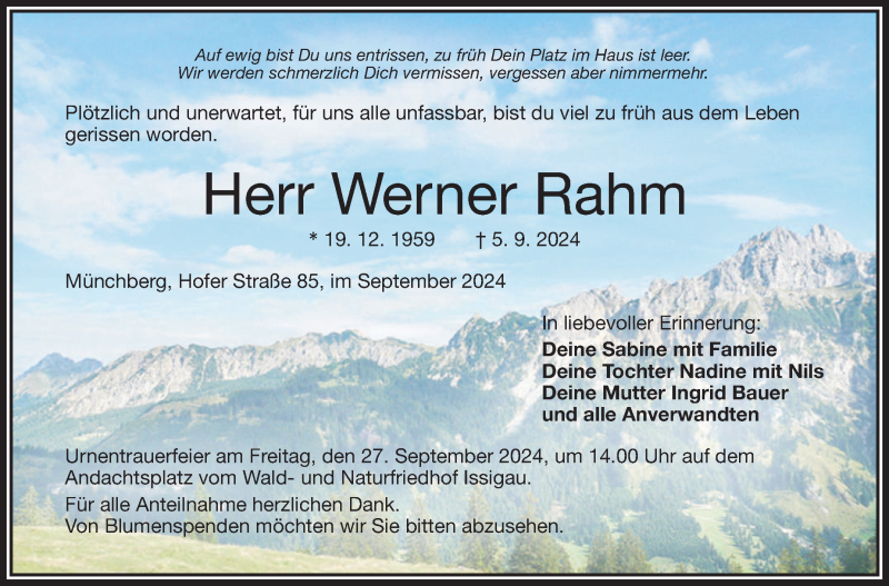 Hier finden Sie alle Traueranzeigen aus der Zeitung, die bisher für Werner Rahm erschienen sind. Weitere Traueranzeigen, die in der Zeitung erscheinen, werden hier ebenfalls aufgelistet