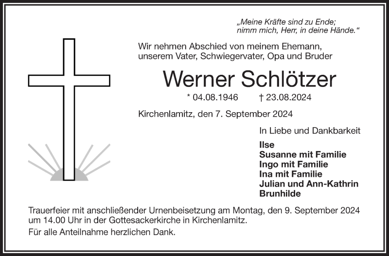 Hier finden Sie alle Traueranzeigen aus der Zeitung, die bisher für Werner Schlötzer erschienen sind. Weitere Traueranzeigen, die in der Zeitung erscheinen, werden hier ebenfalls aufgelistet