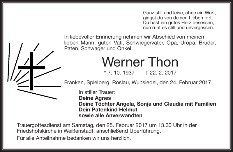 Hier finden Sie alle Traueranzeigen aus der Zeitung, die bisher für Werner Thon erschienen sind. Weitere Traueranzeigen, die in der Zeitung erscheinen, werden hier ebenfalls aufgelistet