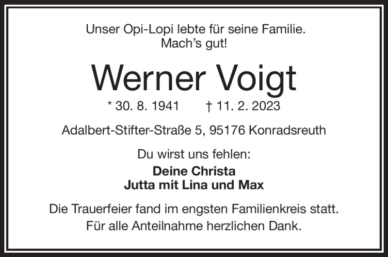 Hier finden Sie alle Traueranzeigen aus der Zeitung, die bisher für Werner Voigt erschienen sind. Weitere Traueranzeigen, die in der Zeitung erscheinen, werden hier ebenfalls aufgelistet