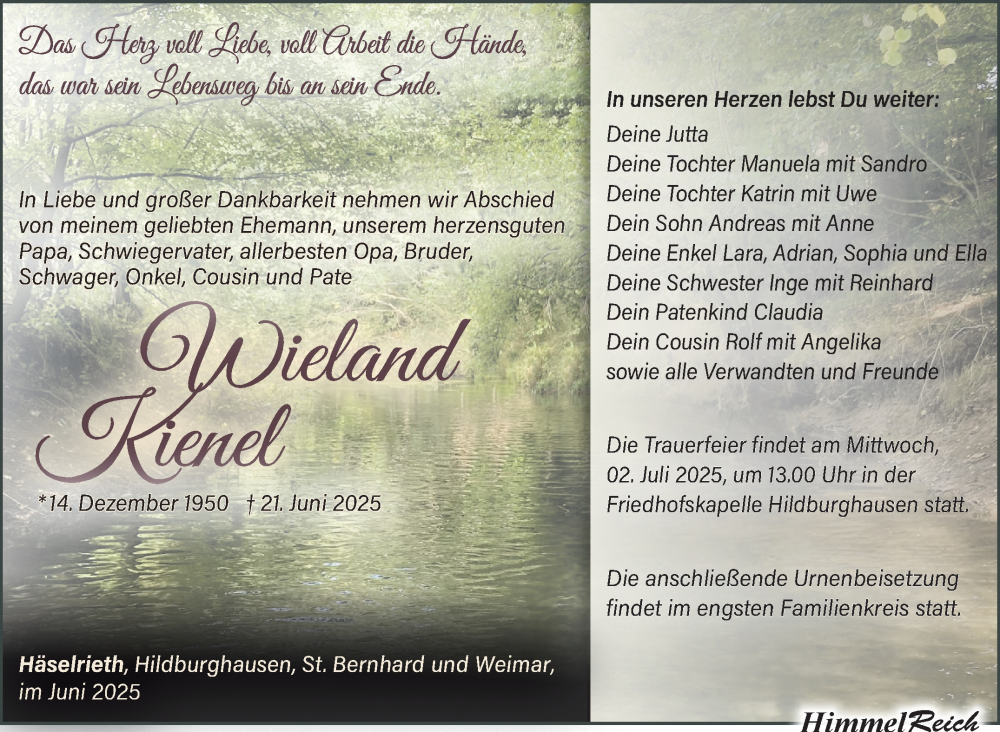 Hier finden Sie alle Traueranzeigen aus der Zeitung, die bisher für Wieland Kienel erschienen sind. Weitere Traueranzeigen, die in der Zeitung erscheinen, werden hier ebenfalls aufgelistet
