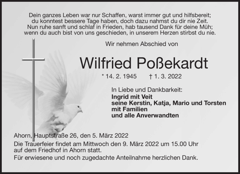 Hier finden Sie alle Traueranzeigen aus der Zeitung, die bisher für Wilfried Poßekardt erschienen sind. Weitere Traueranzeigen, die in der Zeitung erscheinen, werden hier ebenfalls aufgelistet