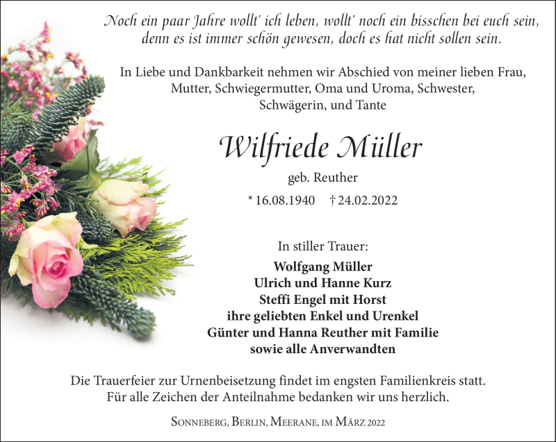 Hier finden Sie alle Traueranzeigen aus der Zeitung, die bisher für Wilfriede Müller erschienen sind. Weitere Traueranzeigen, die in der Zeitung erscheinen, werden hier ebenfalls aufgelistet