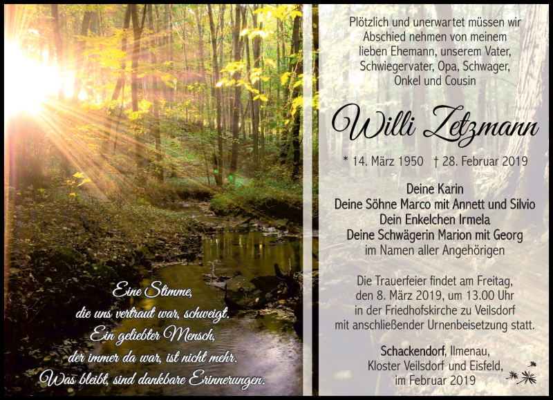 Hier finden Sie alle Traueranzeigen aus der Zeitung, die bisher für Willi Zetzmann erschienen sind. Weitere Traueranzeigen, die in der Zeitung erscheinen, werden hier ebenfalls aufgelistet