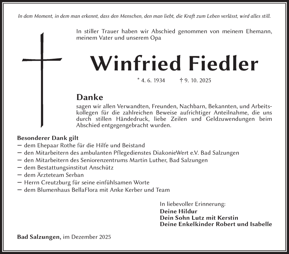 Hier finden Sie alle Traueranzeigen aus der Zeitung, die bisher für Winfried Fiedler erschienen sind. Weitere Traueranzeigen, die in der Zeitung erscheinen, werden hier ebenfalls aufgelistet