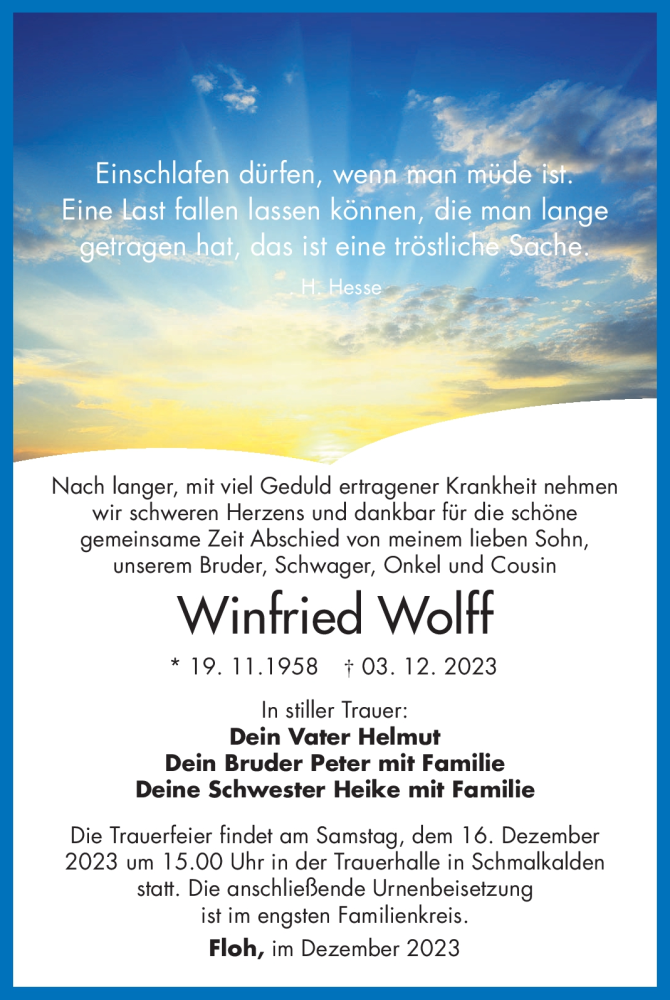 Hier finden Sie alle Traueranzeigen aus der Zeitung, die bisher für Winfried Wolff erschienen sind. Weitere Traueranzeigen, die in der Zeitung erscheinen, werden hier ebenfalls aufgelistet