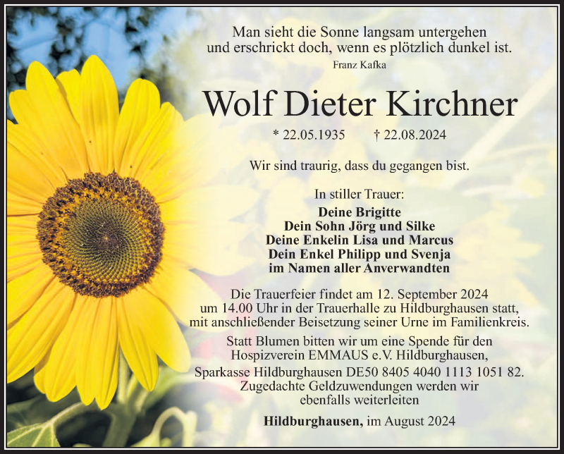 Hier finden Sie alle Traueranzeigen aus der Zeitung, die bisher für Wolf Dieter Kirchner erschienen sind. Weitere Traueranzeigen, die in der Zeitung erscheinen, werden hier ebenfalls aufgelistet