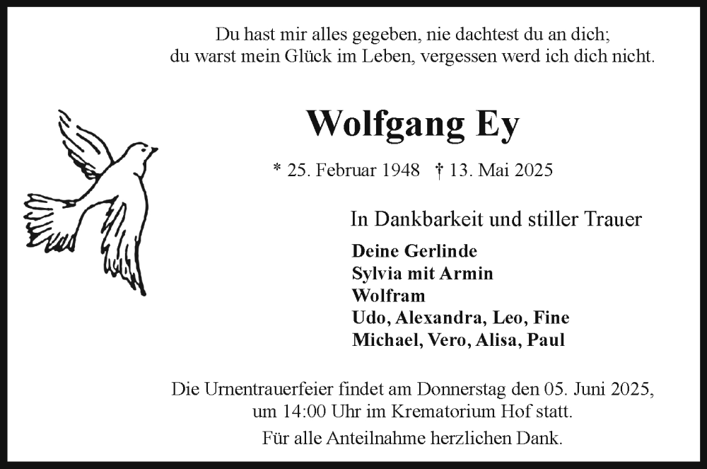 Hier finden Sie alle Traueranzeigen aus der Zeitung, die bisher für Wolfgang Ey erschienen sind. Weitere Traueranzeigen, die in der Zeitung erscheinen, werden hier ebenfalls aufgelistet