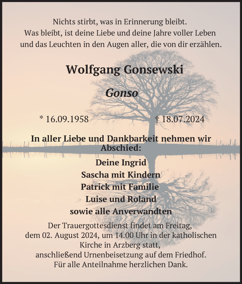 Hier finden Sie alle Traueranzeigen aus der Zeitung, die bisher für Wolfgang Gonsewski erschienen sind. Weitere Traueranzeigen, die in der Zeitung erscheinen, werden hier ebenfalls aufgelistet