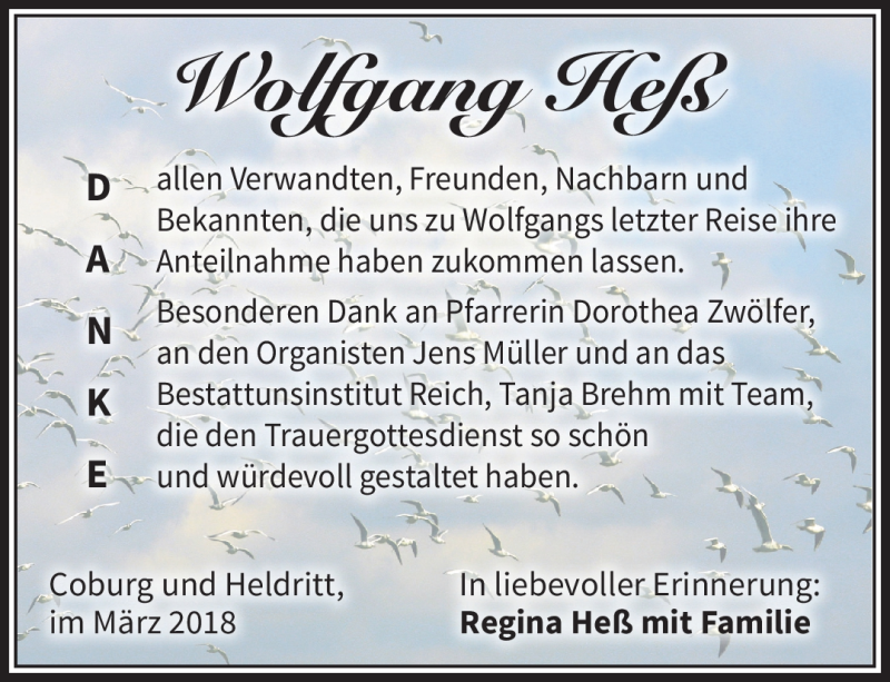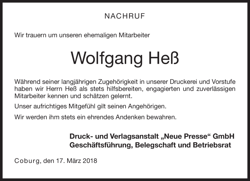Hier finden Sie alle Traueranzeigen aus der Zeitung, die bisher für Wolfgang Heß erschienen sind. Weitere Traueranzeigen, die in der Zeitung erscheinen, werden hier ebenfalls aufgelistet
